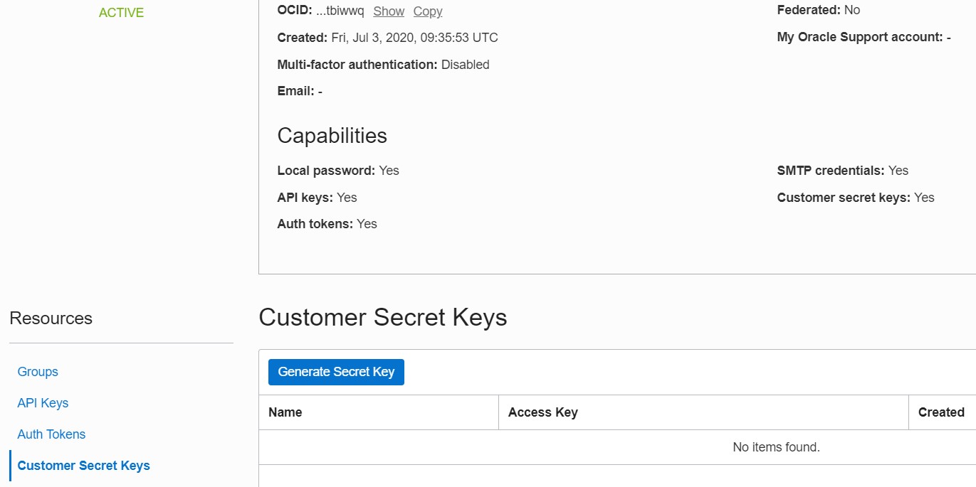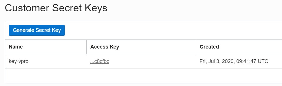 Scroll down and open the "Customer Secret Keys" tab. Click on Generate Secret Key.