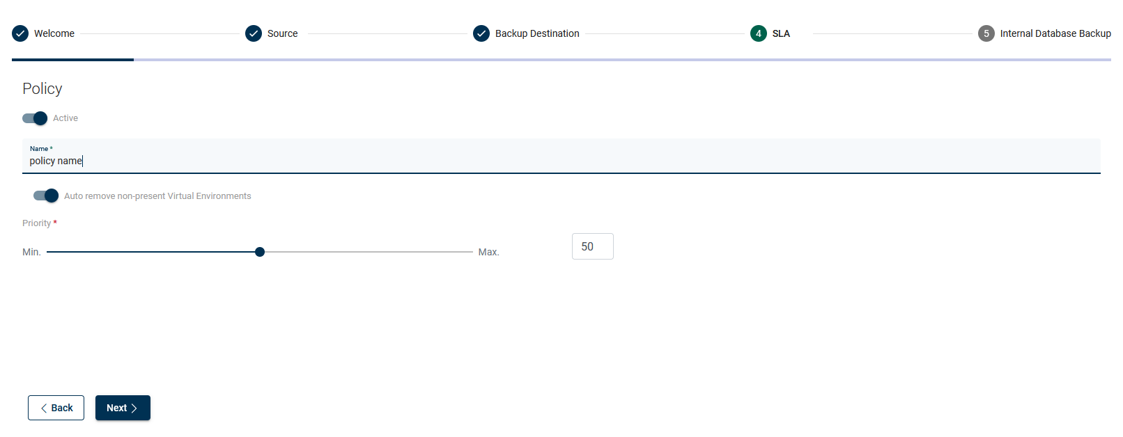 Choose a name for the policy, auto-remove non-present virtual environments (if vPlus should remove VM from a policy that no longer exists) tick the checkbox, and set the priority.