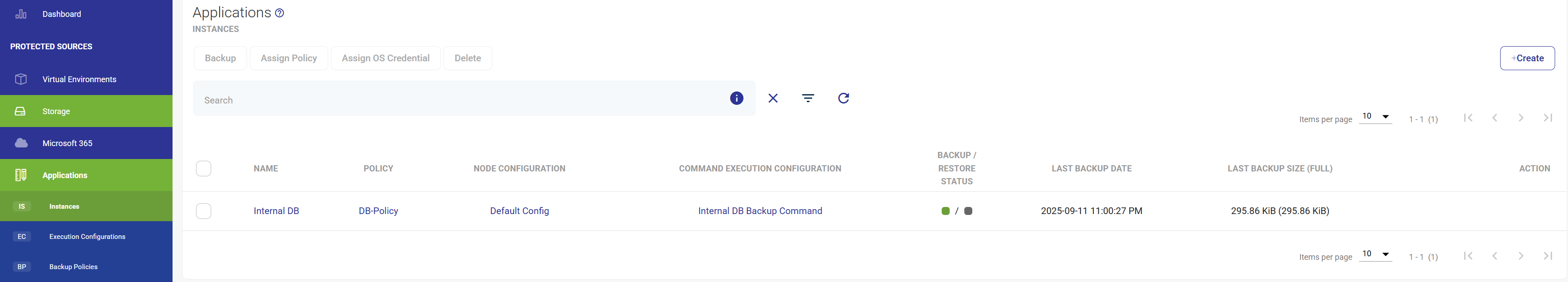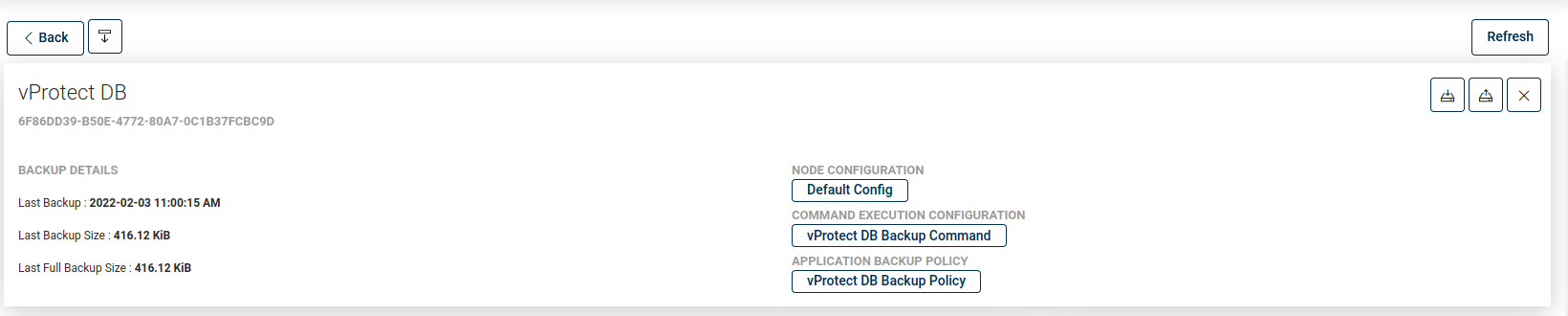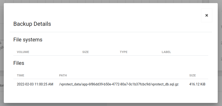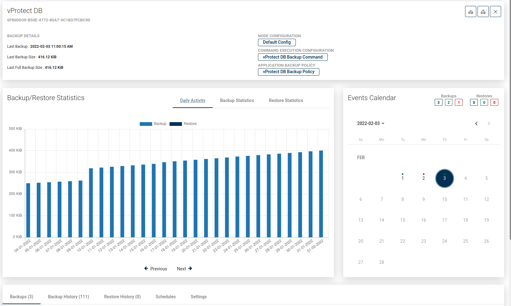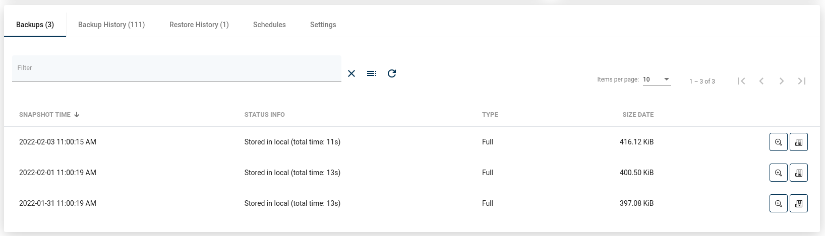 This tab shows information about all backups made for this application, including those failed, removed (because of retention), or currently executing.