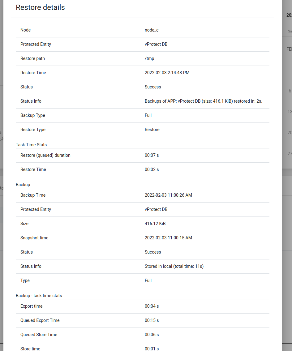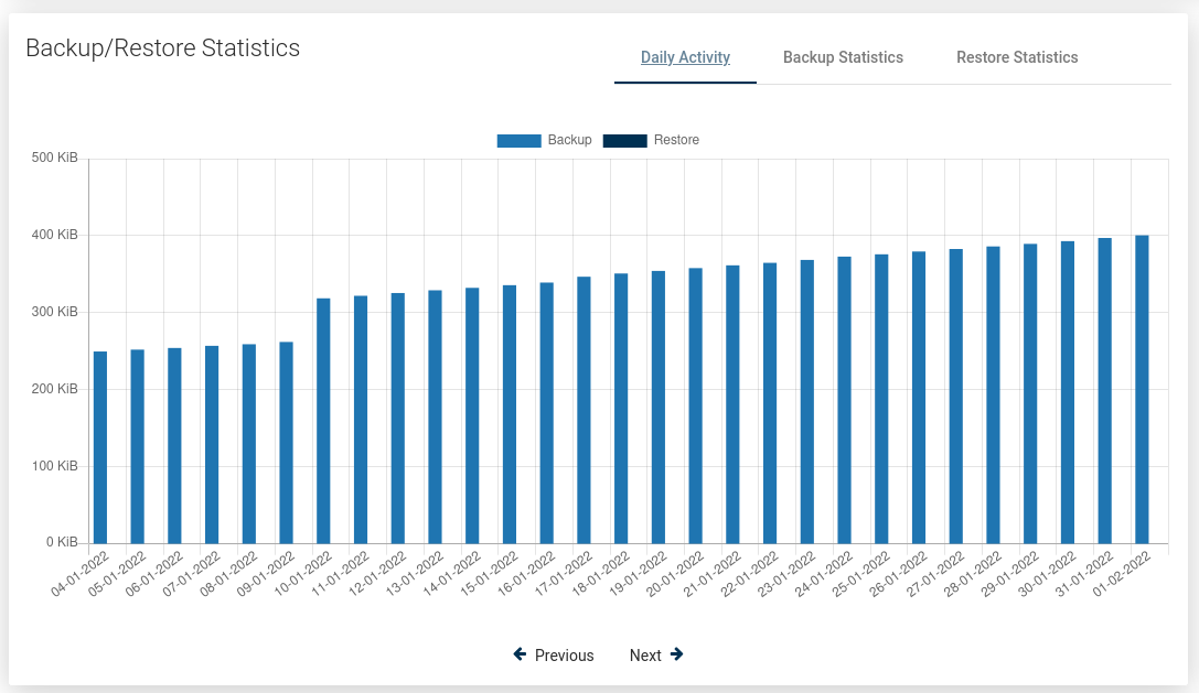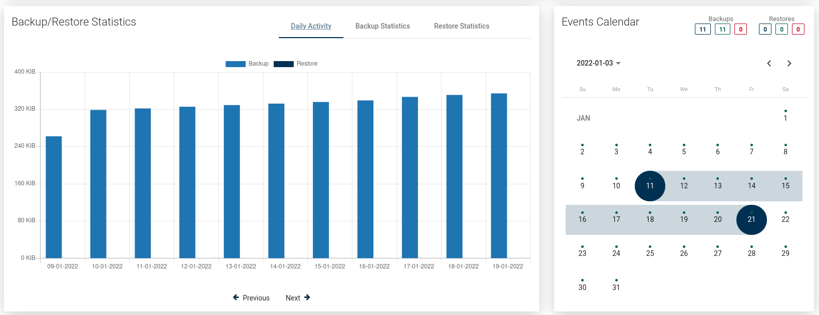 The calendar extends the possibilities of adjacent statistics. It allows you to neatly define the range of days you want to see, and additionally makes a quick summary of the number of backups and restores (top right corner).