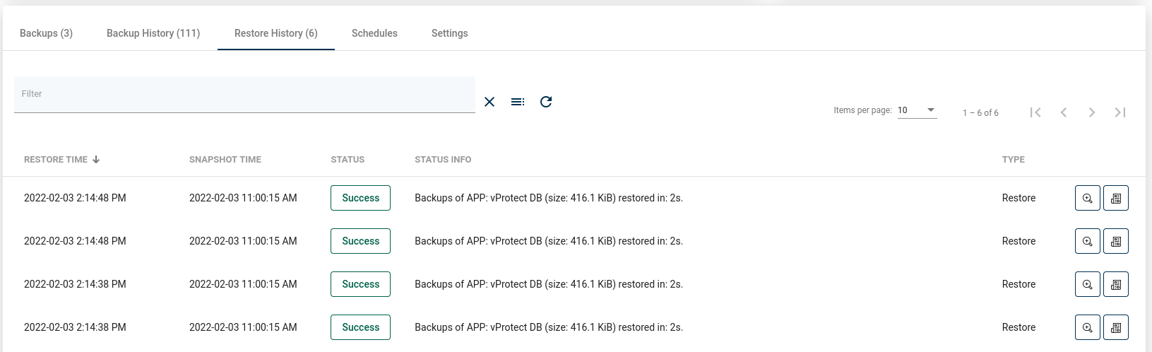 This tab is similar to "Backup History". This is a list with basic information about the application restores performed. When you open the details of the selected restore, you will see much more detailed information.
