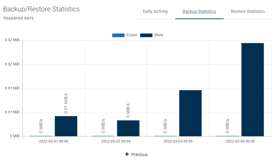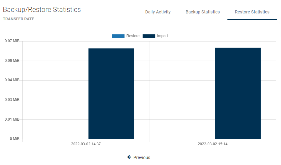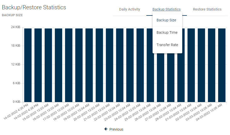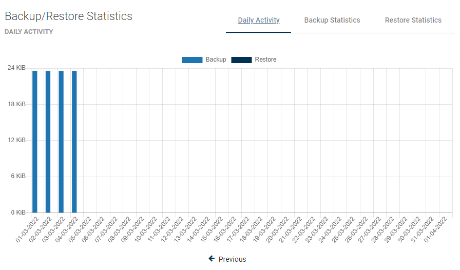 First, you'll see a daily summary of the backup and restore operations for the last month. This view is called "Daily Summary" and is the default view. You can switch the report between four views.