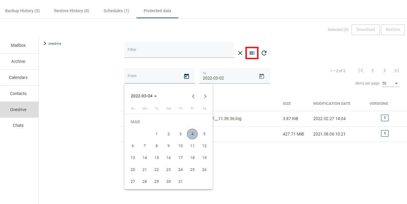 You can always use the filters to move back in time to select the exact moment from the calendar and restore or download data.