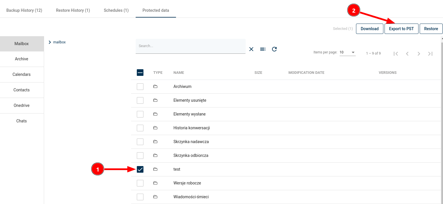 This feature allow you to download data and save it as PST file. Currently available only for Mailboxes.