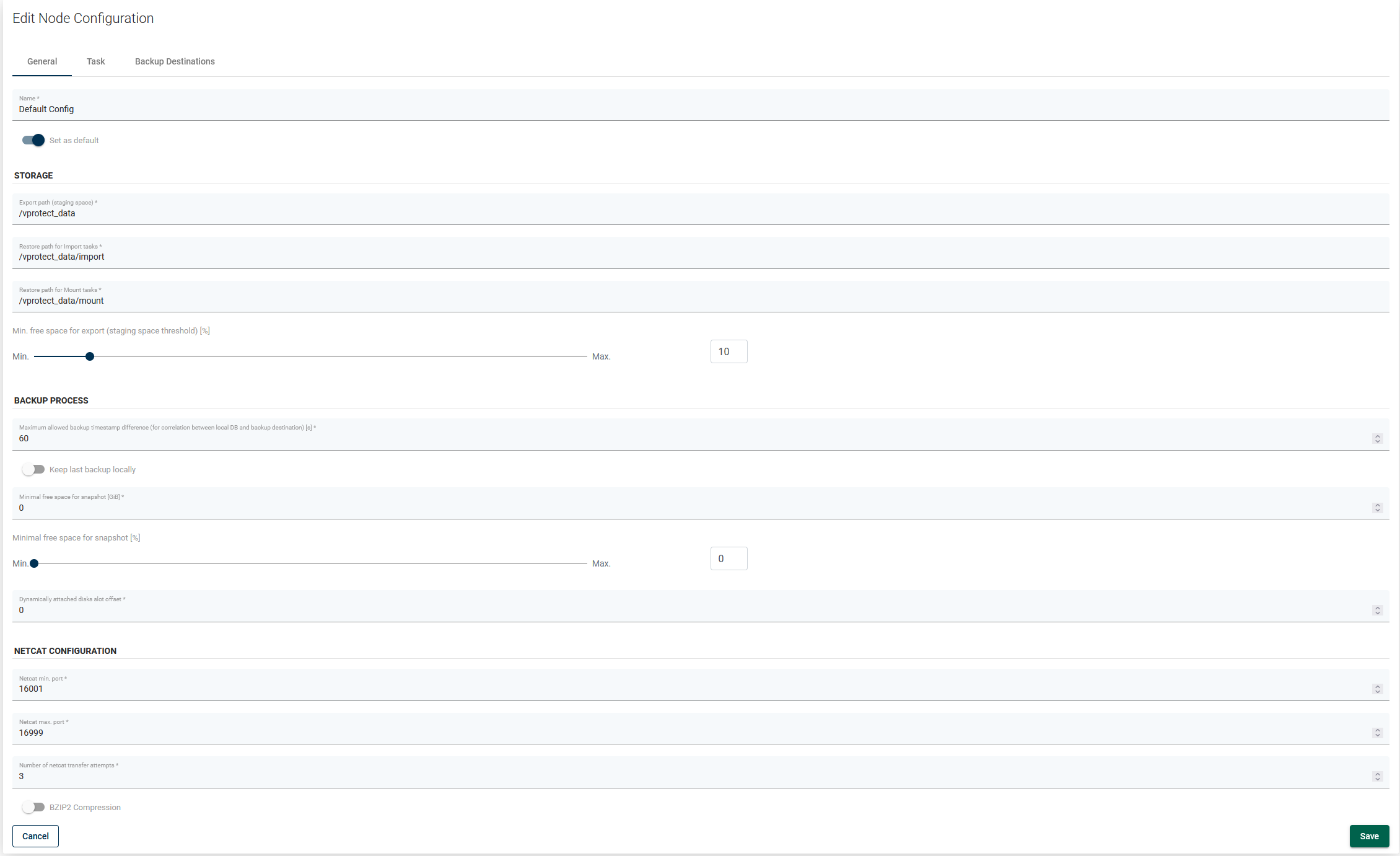 Export path (staging space)- staging path (must be owned by thevprotectuser)Restore path for import tasks- in rare cases, you may want to restore backups to a custom location within the node before the import process beginsRestore path for mount tasks- in rare cases, you may want to restore backups to a custom location within the node before the mounting process beginsMin. free space for export [%]- the amount of storage space left in order to force a node to wait before starting another export task