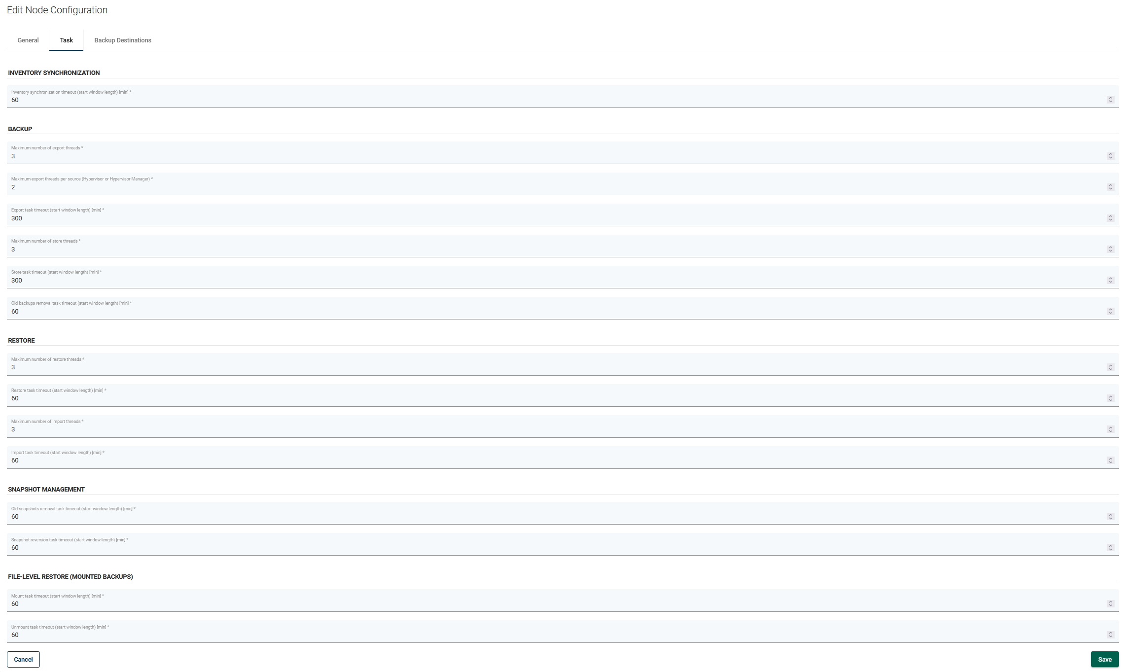 Maximum number of export threads- max. number of export tasks per node (total)Maximum export threads per source (HV or HVM)- max. number of export tasks per node and per HV/HVMExport task timeout (start window length) [min]- default length of the start window for export tasksMaximum number of store threads- max. number of store tasks per nodeStore task timeout (start window length) [min]- default length of the start window for store tasksOld backups removal task timeout (start window length) [min]- default length of start window for old backup removal tasks