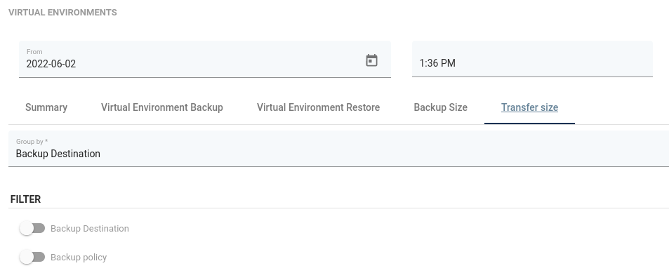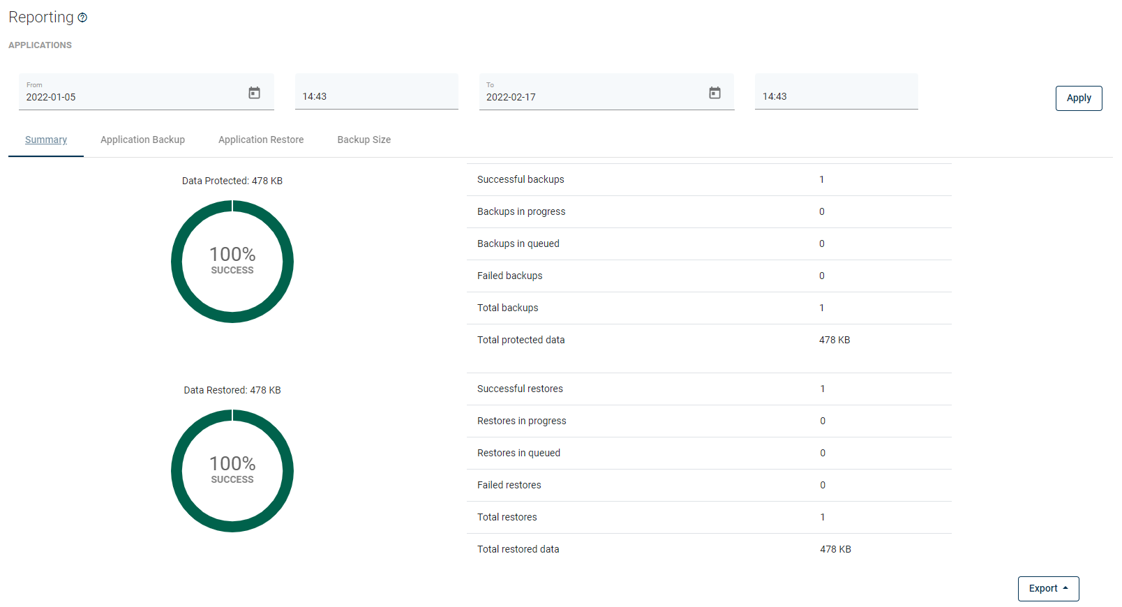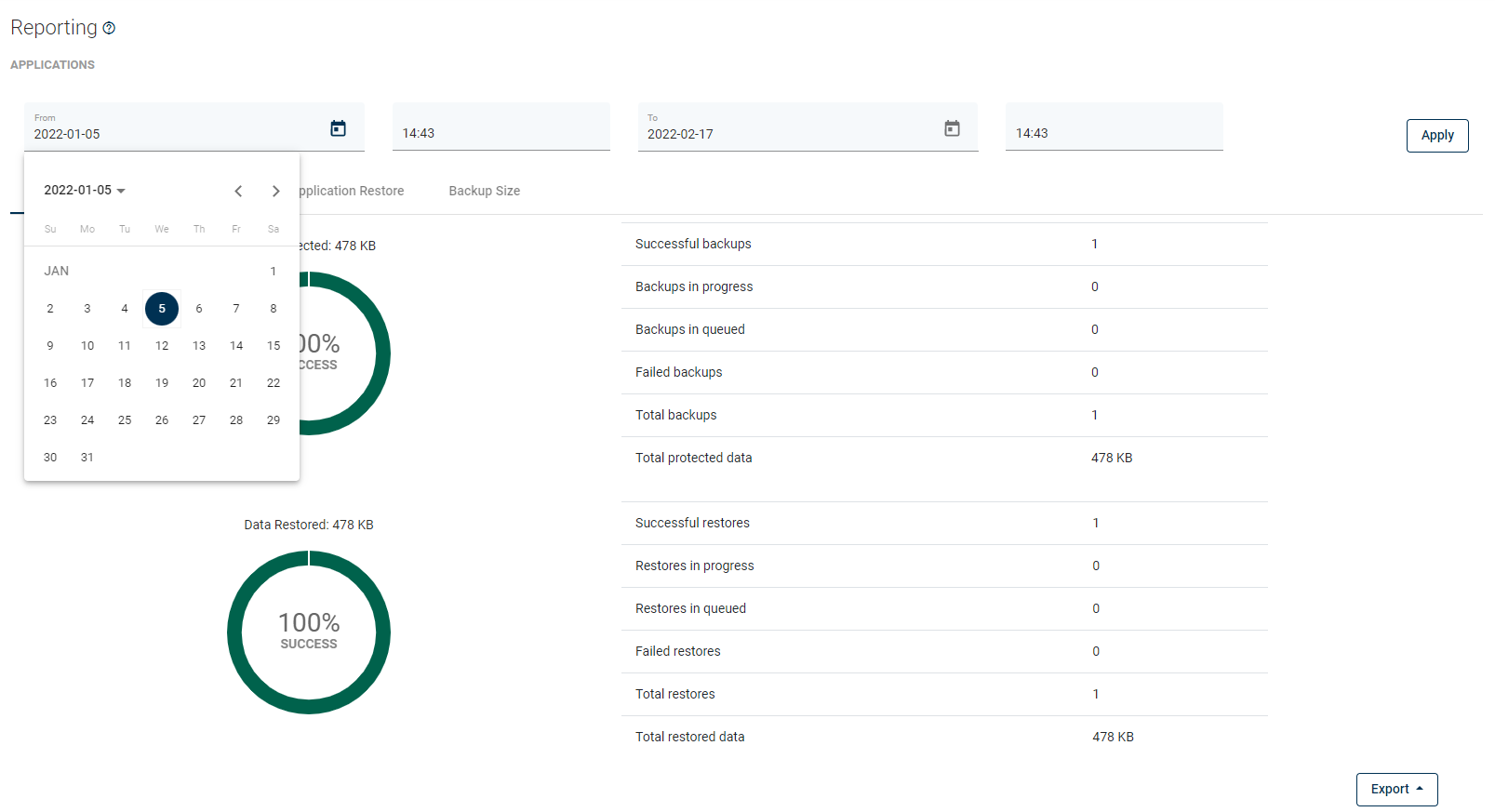 From here, you can set a date range or go to a detailed summary of backup, restore jobs, and backup size.