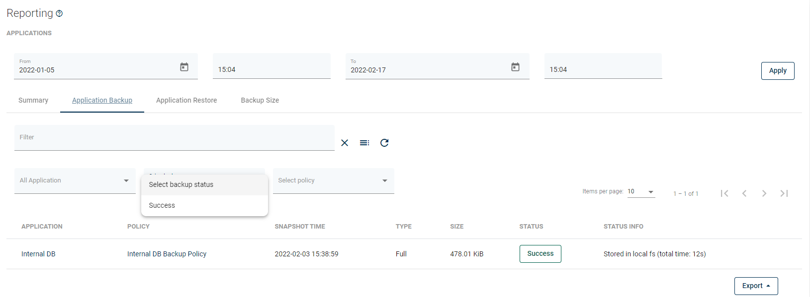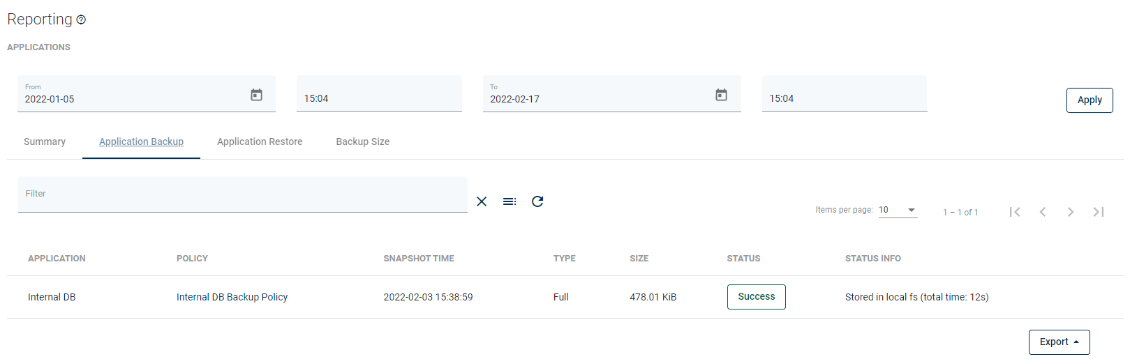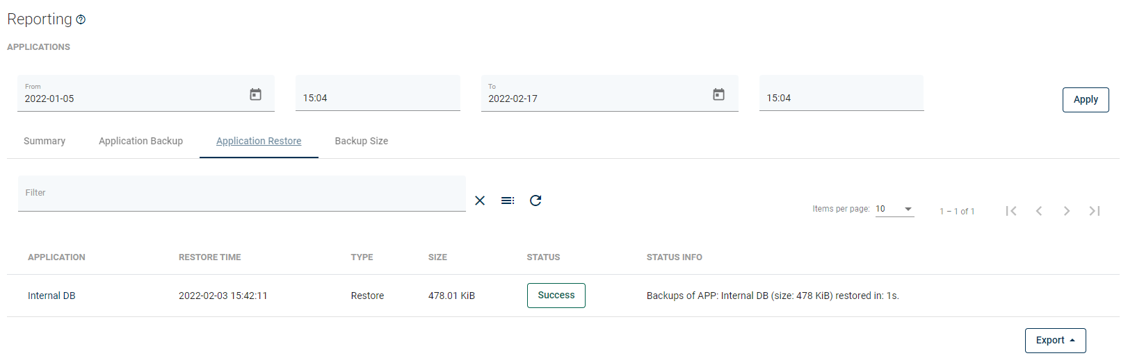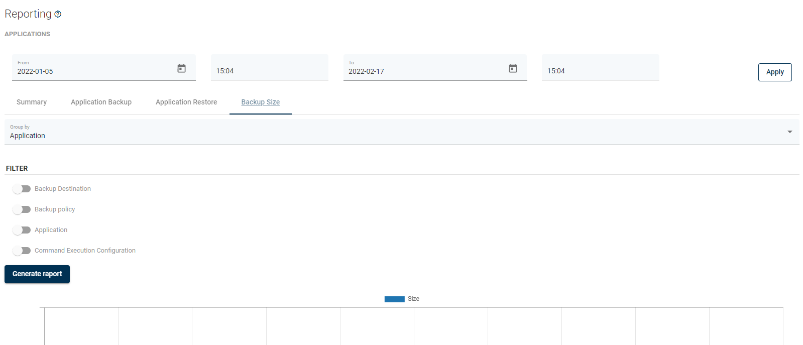 From here, you can set a date range or go to a detailed summary of backup, restore jobs, and backup size.