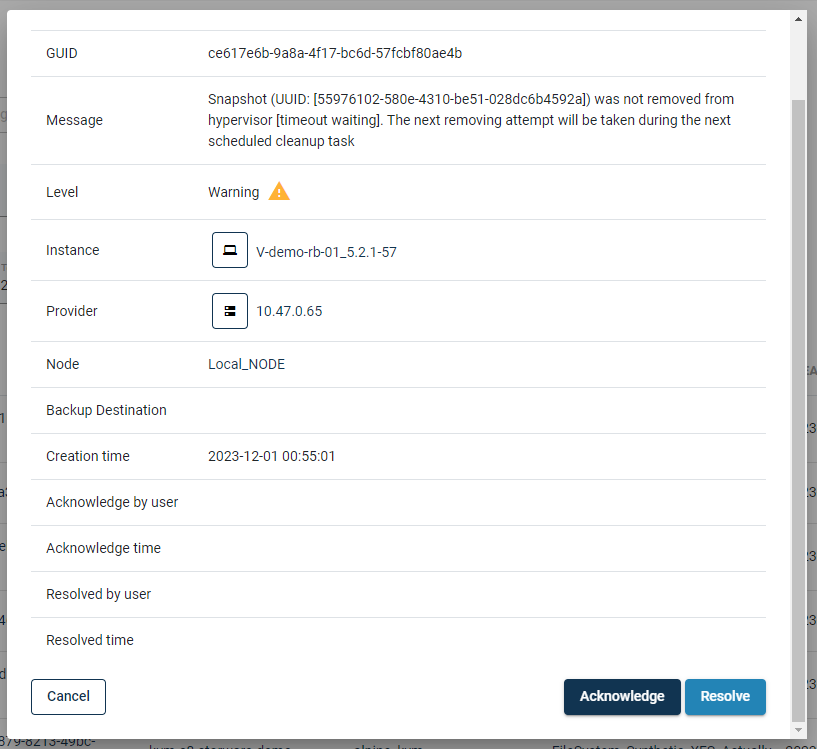 - Click on the button "Acknowledge" or "Resolve" depending on which status you would like to set