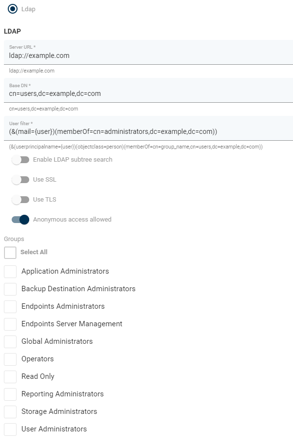Enable LDAP subtree search- when disabled, only 1 level below base DN is being searchedUse SSL- enables SSL for LDAP connection ('ldaps://')Use TLS- enables TLS for LDAP connectionAnonymous access allowed- if users are not allowed to anonymously browse LDAP directory you need to provide an account that has that privilege:Service account DN- DN of the userService account password- password of that user