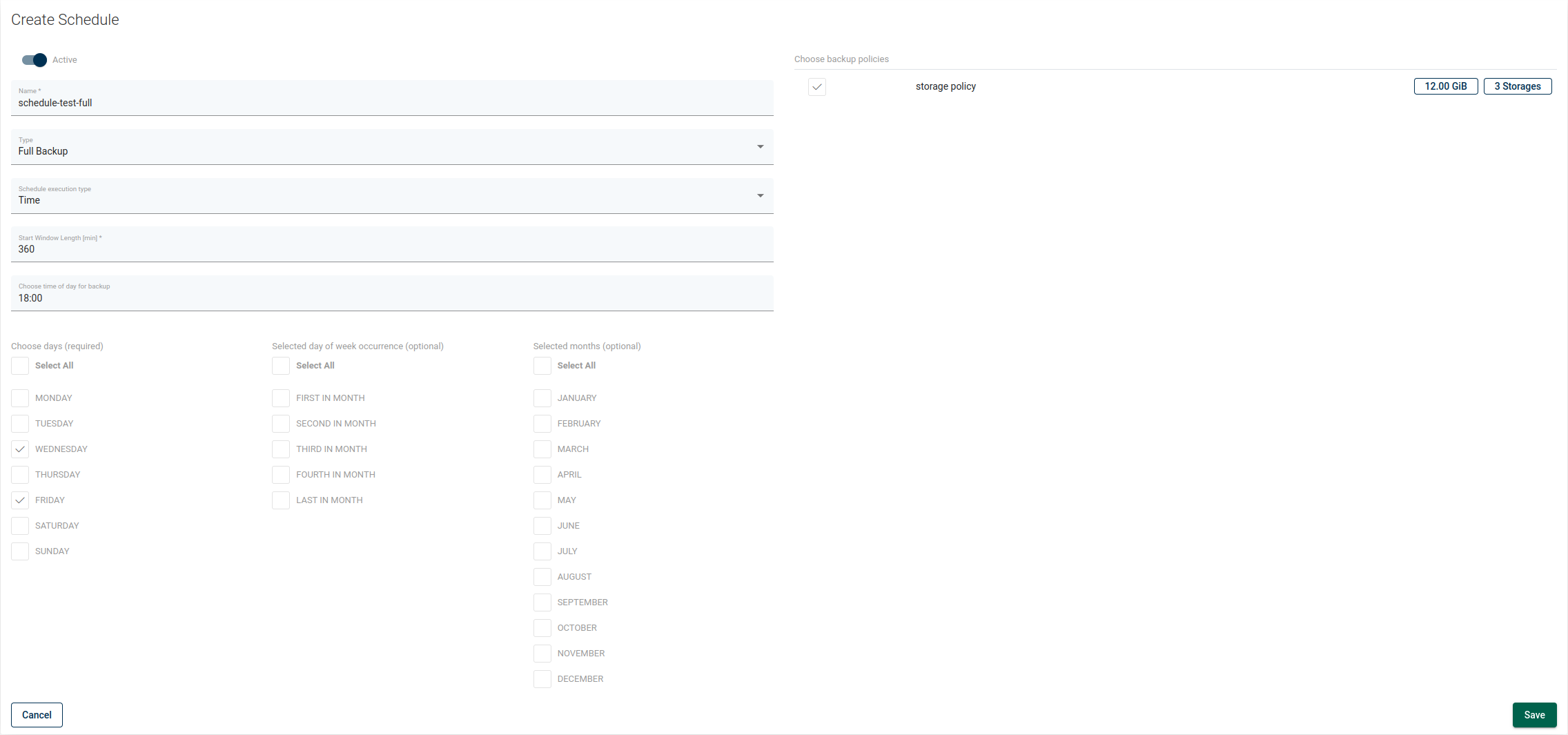 Schedule Active- enable or disable executing scheduleName- schedule nameBackup Type- defines backup type: full or incrementalExecution Type- choose time or interval modeStart Window- defines for how long since the task start time scheduled tasks are allowed to be executedChoose time of day- for the time execution mode, this defines when the task should be added to the queueChoose time of interval start- for the interval execution mode, this defines when tasks should startChoose time of interval end- for the interval execution mode, this defines when tasks should endFrequency- defines how often the task will be executed during the intervalChoose days- last required parameter, select days of the week on which the task will be performed