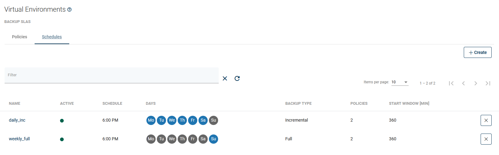 A schedule defines when and on which days VMs should be backup. To define a new schedule, open Backup SLAs under the Virtual Environments section and go to the Schedules tab, then use the button.