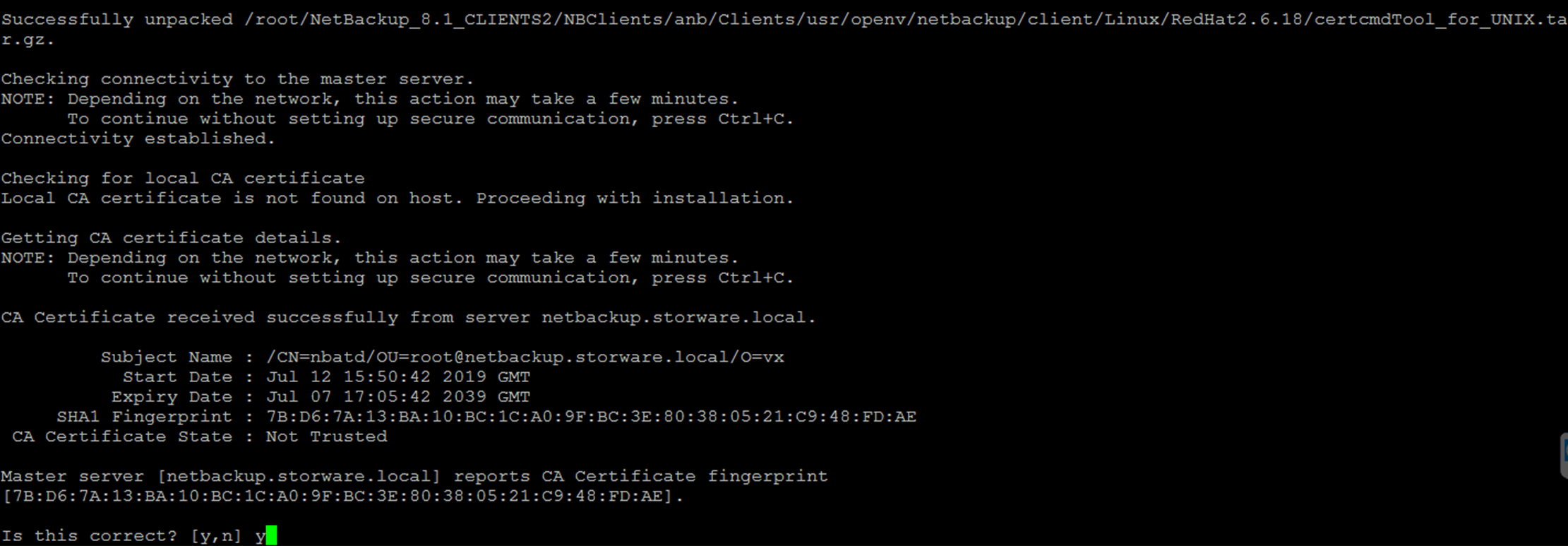 - After you have confirmed the fingerprint information, the installer stores the authority certificate details.