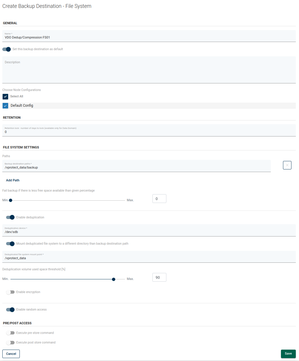 Note: Only one file system backup destination with deduplication using VDO pointing to a specific directory can be used. If you want to add another backup destination using the same VDO device, but just a different subdirectory, create it without deduplication enabled.