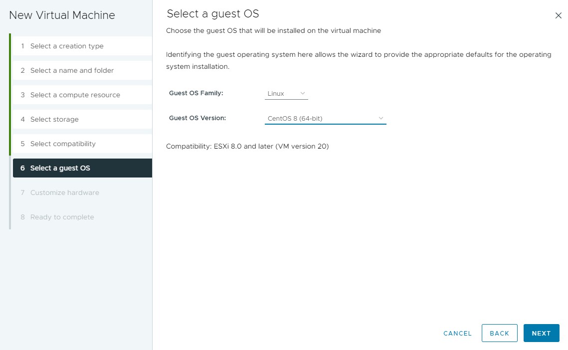 • Select the guest operating system - ideally CentOS Linux 9. If unavailable, choose CentOS 8.
