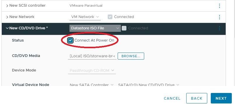 • Ensure "Connect at power on" is checked for the CD/DVD drive.