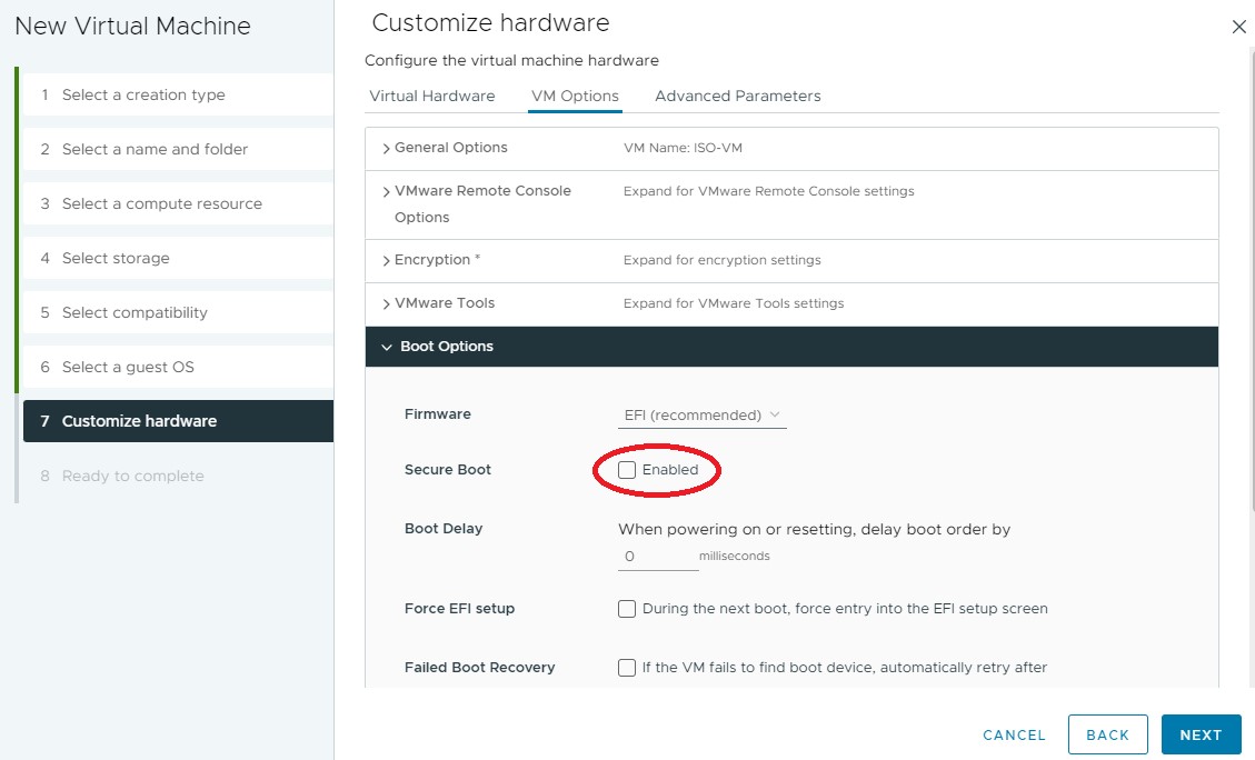 • VM Options: Verify that "Secure Boot" is disabled in the VM Options section.
