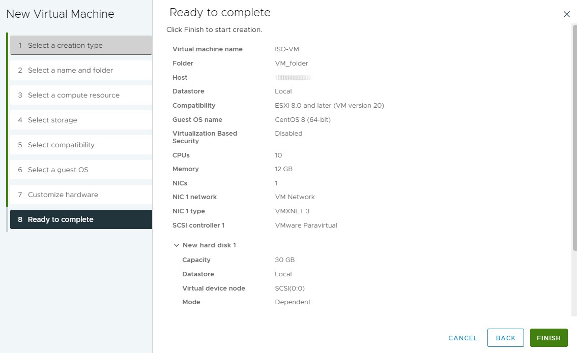 • Review the configuration summary and click "Finish" to create the virtual machine.