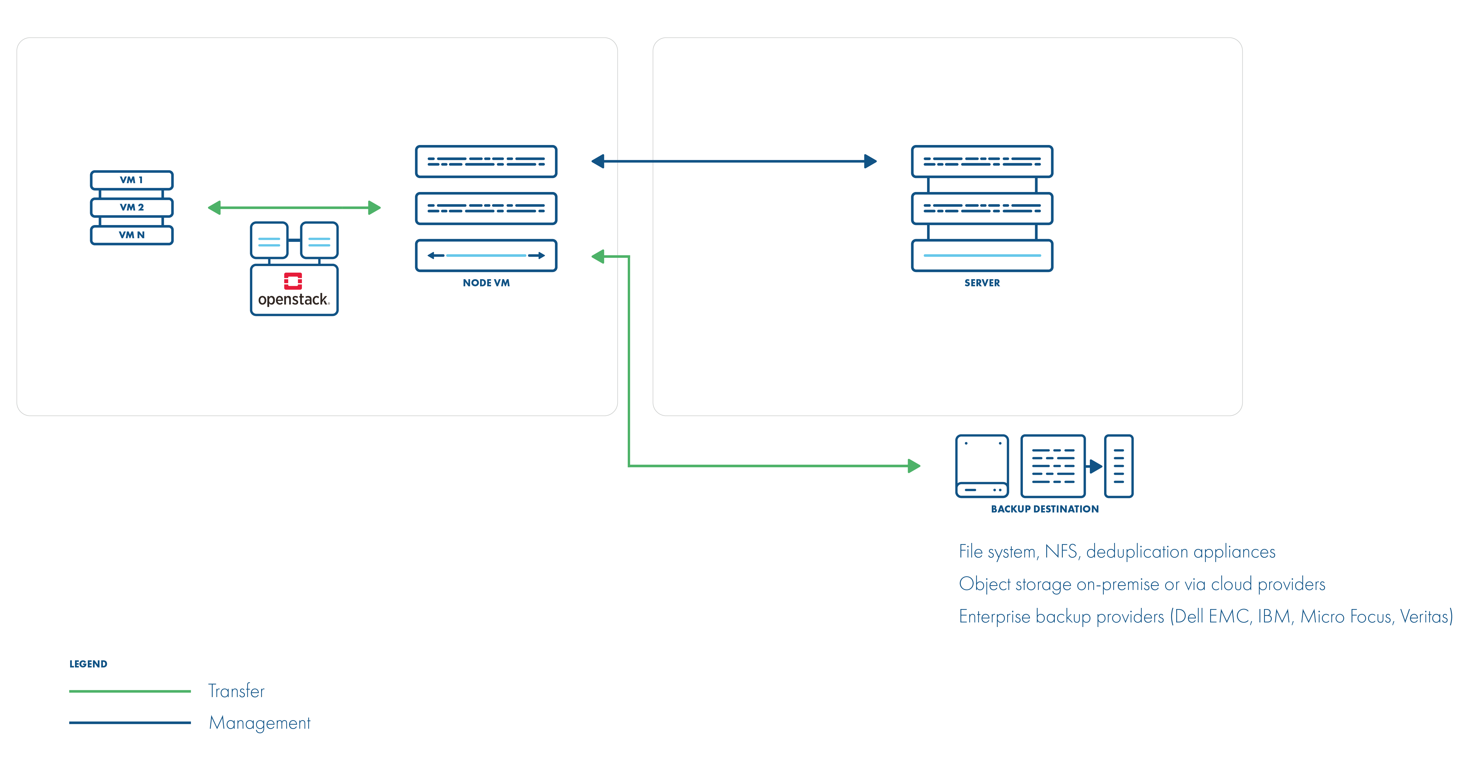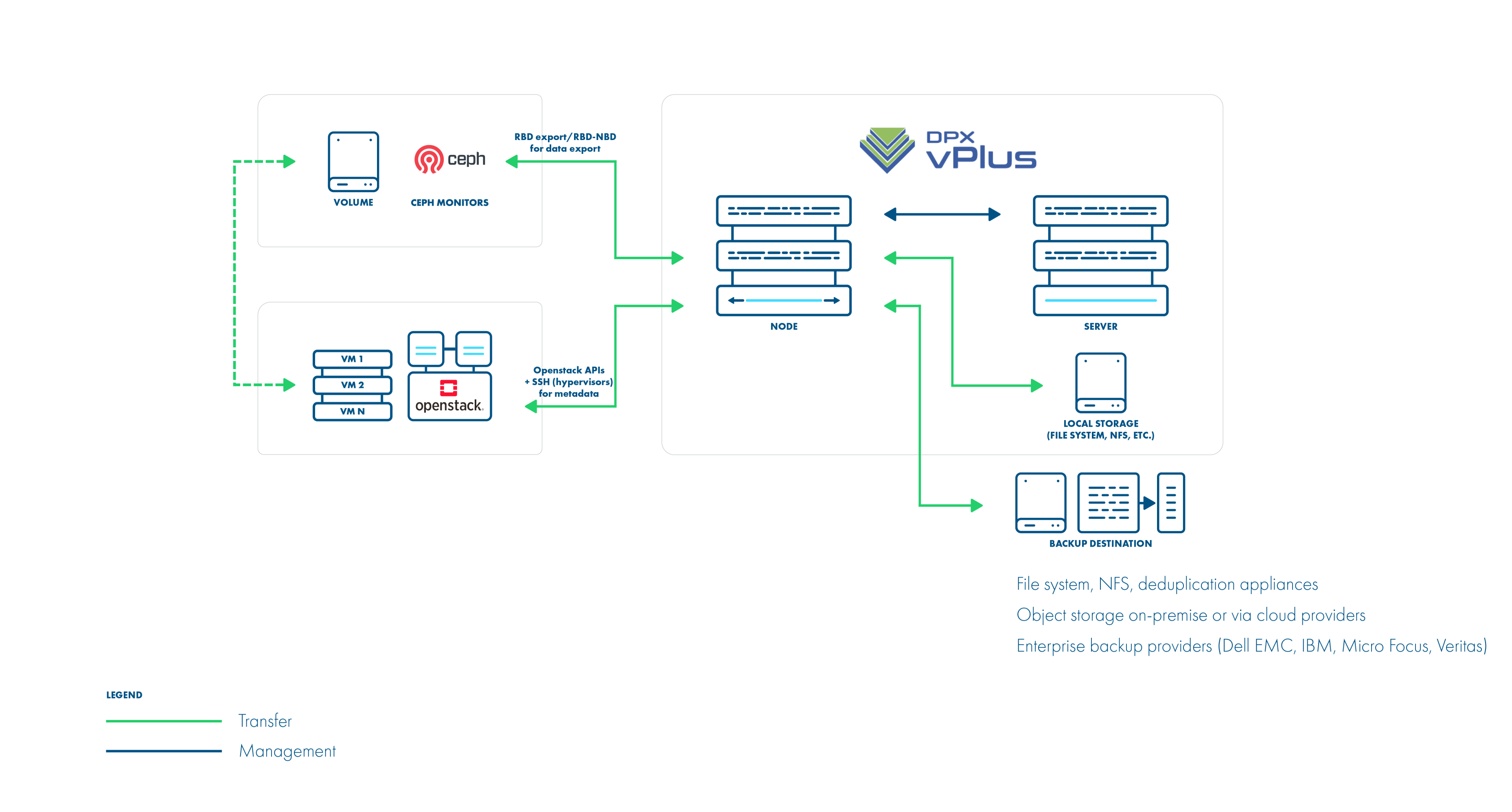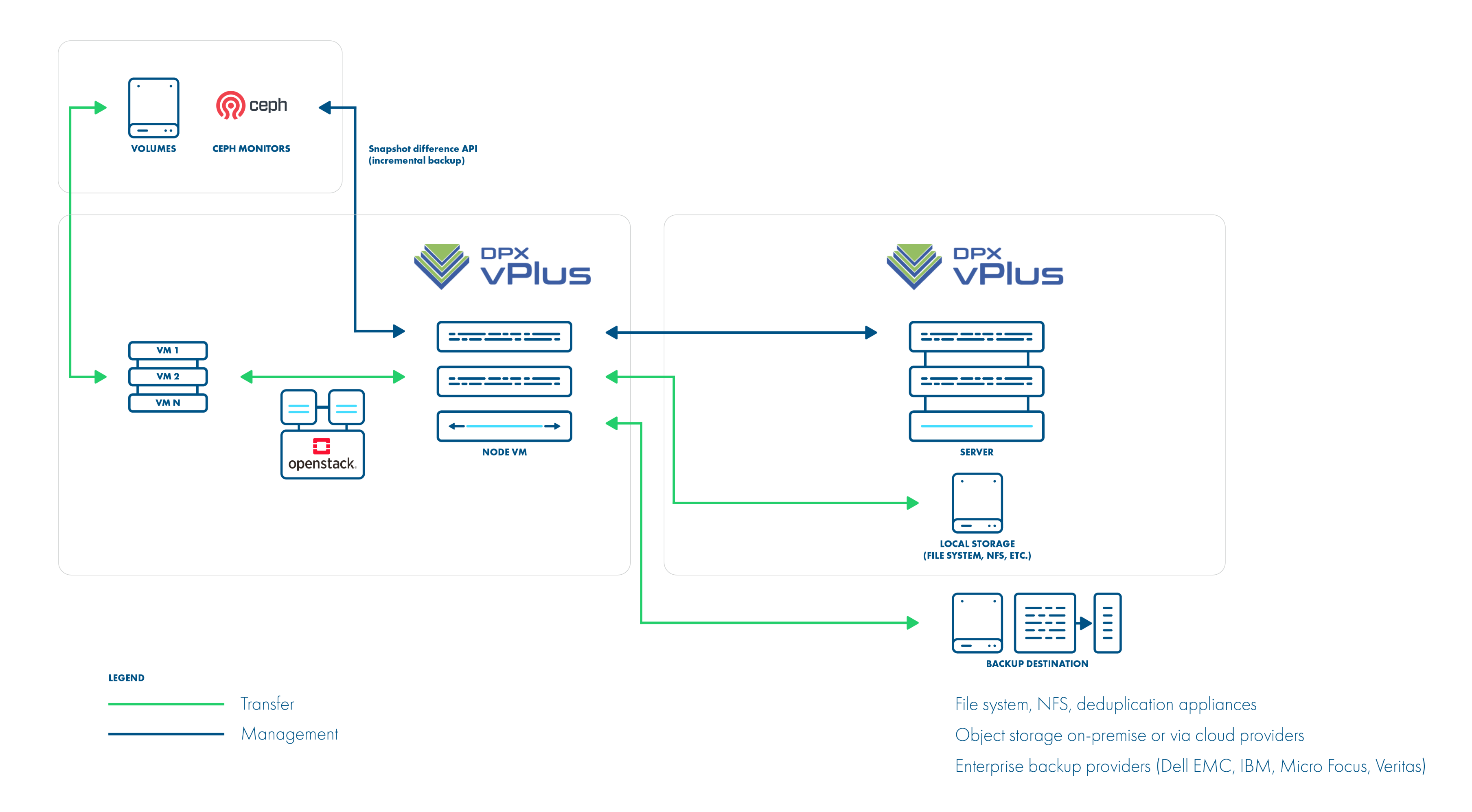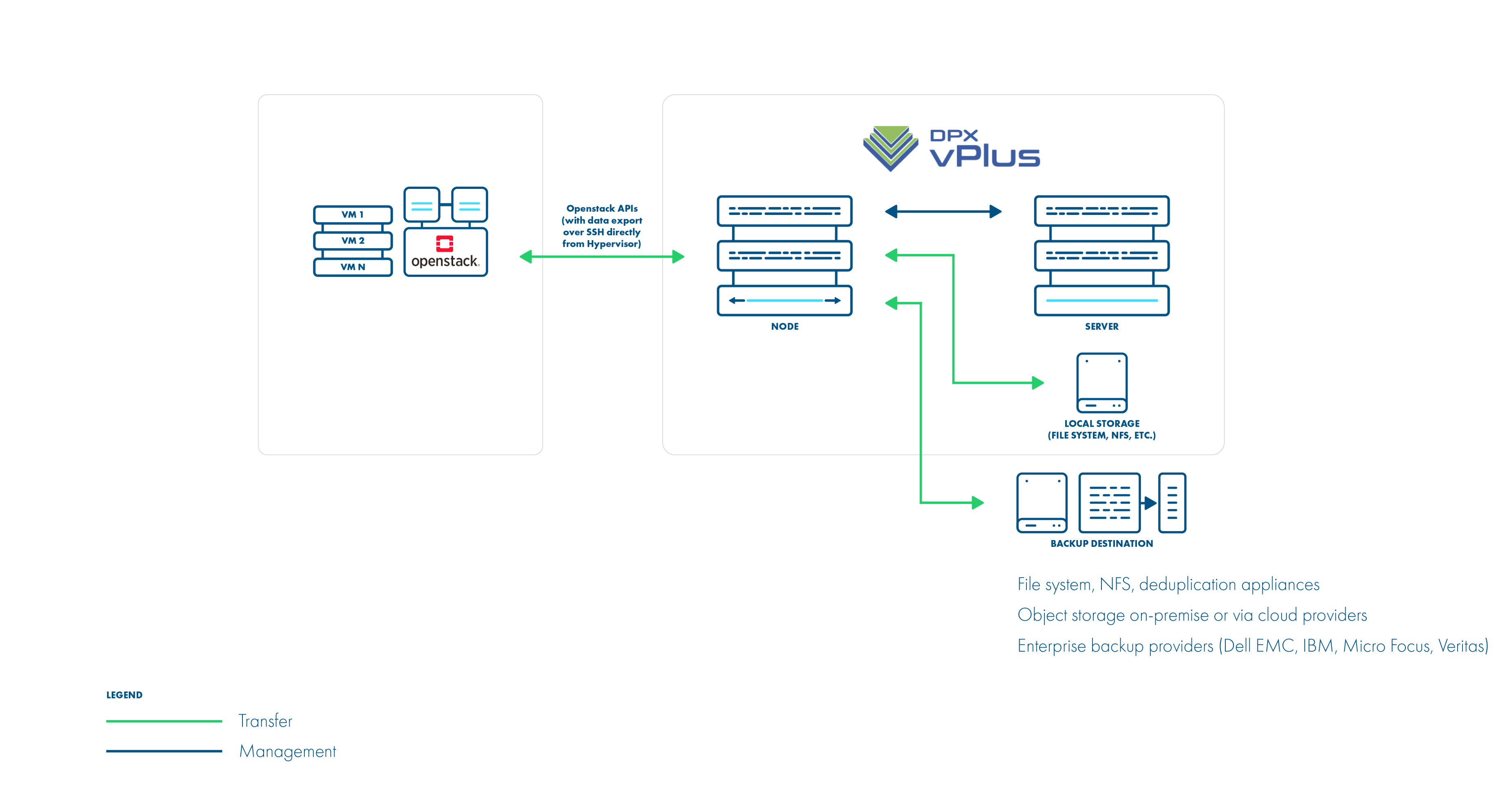 DPX vPlus supports OpenStack environments that use KVM hypervisors and VMs running on QCOW2 or RAW files. DPX vPlus communicates with OpenStack APIs such as Nova and Glance to collect metadata and for the import of the restored process. However, the actual backup is done over SSH directly from the hypervisor. DPX vPlus Node can be installed anywhere - it just needs to have access to the OpenStack APIs and hypervisor SSH via a network. Both full and incremental backups are supported.