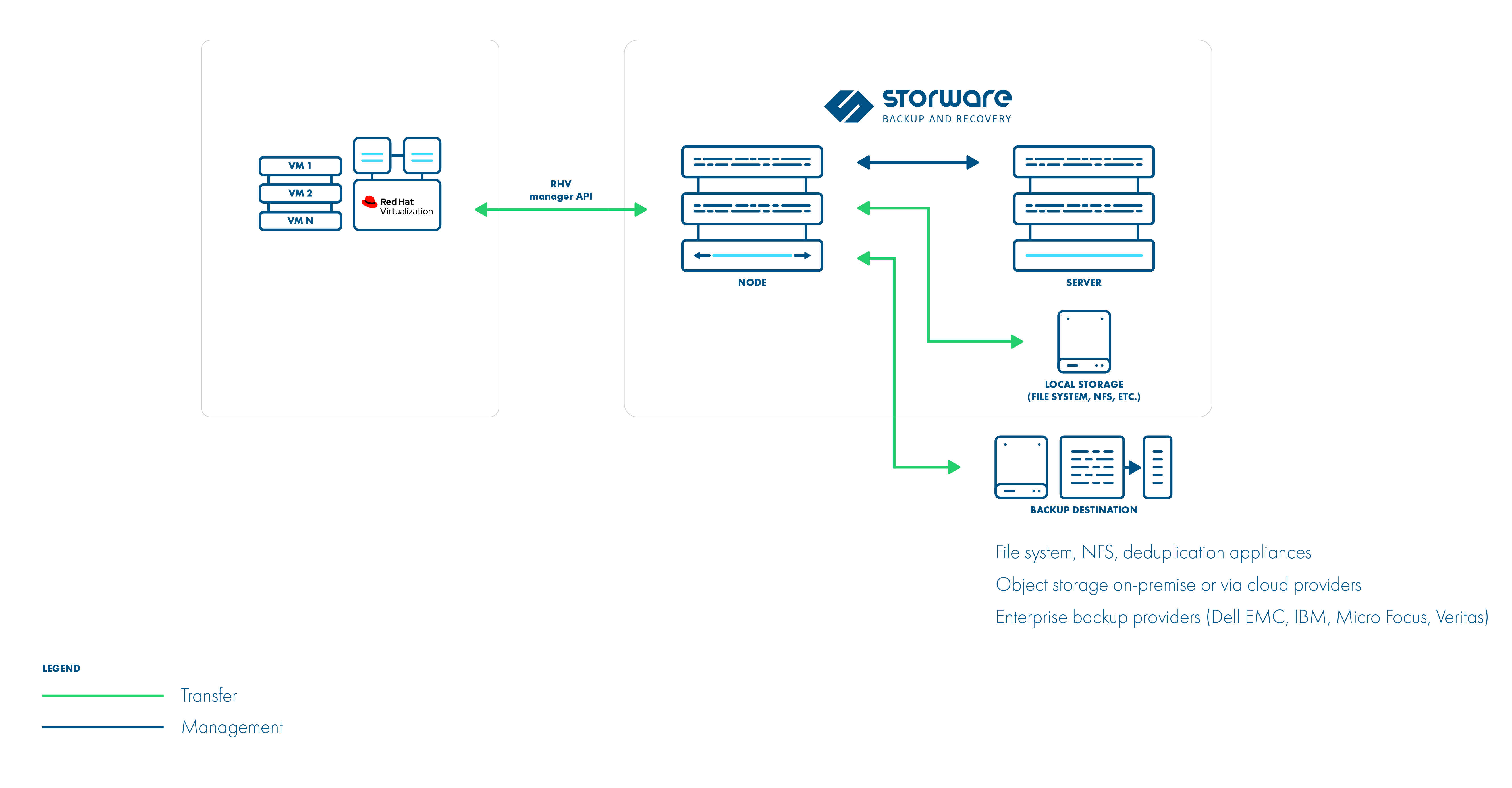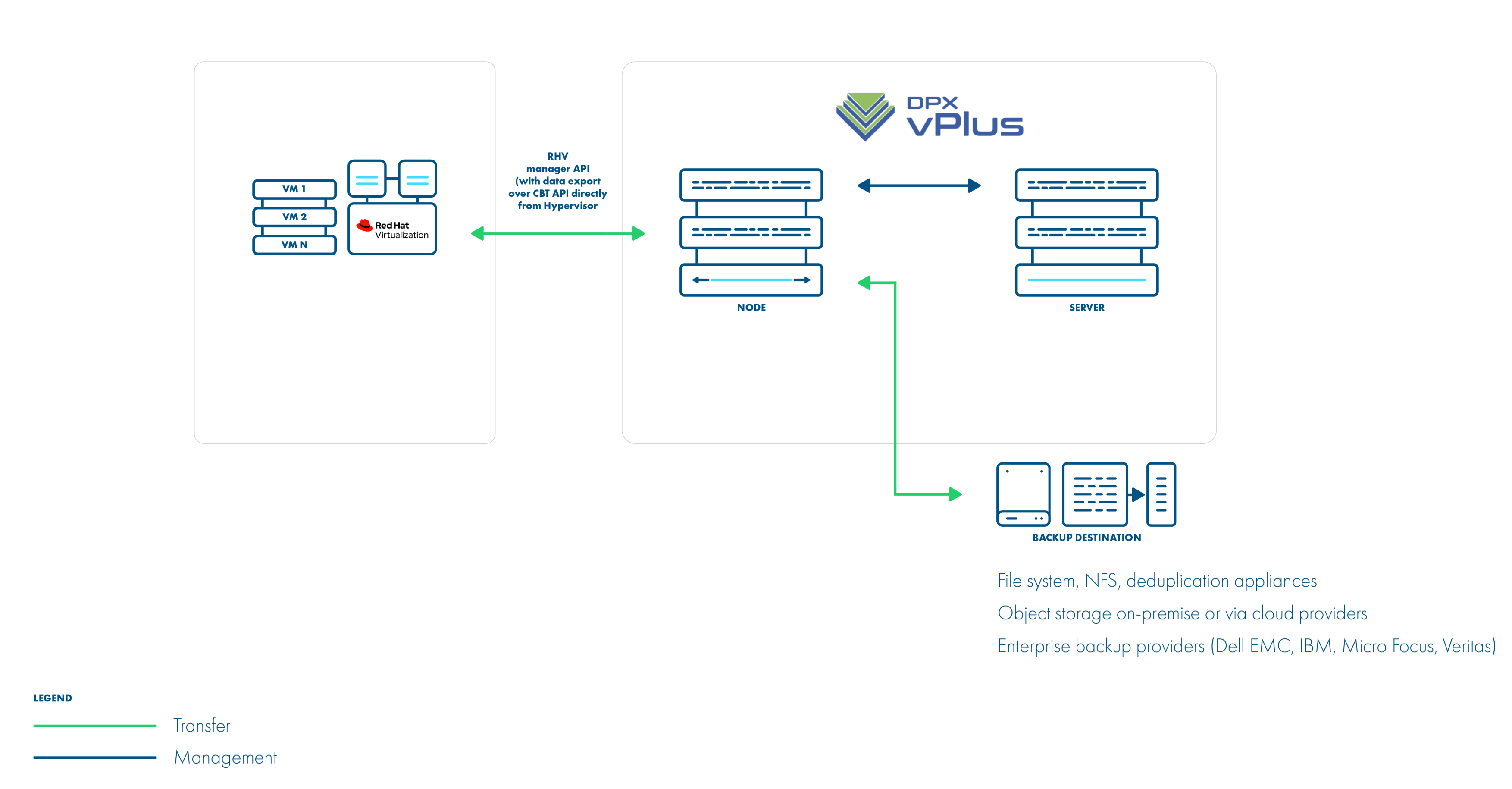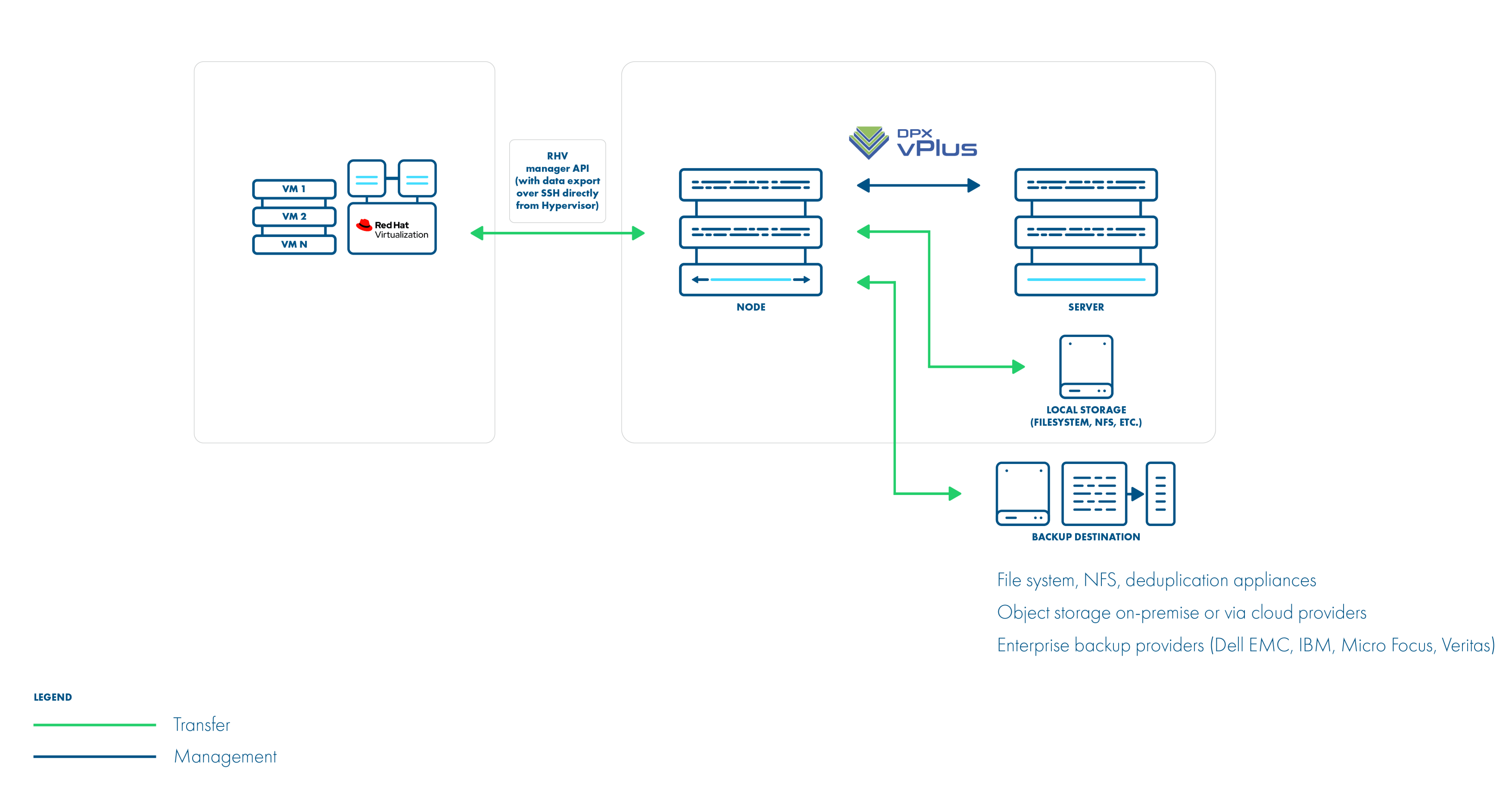 This is an enhancement for the disk image transfer API strategy. It allows DPX vPlus to use RHV API v4.2+ (HTTPS connection to RHV manager) only to collect metadata. Backup is done over SSH directly from the hypervisor (optionally using netcat for transfer), import is also using SSH (without netcat option). No need to install a node on the RHV environment. This method can boost backup transfers and supports incremental backups.