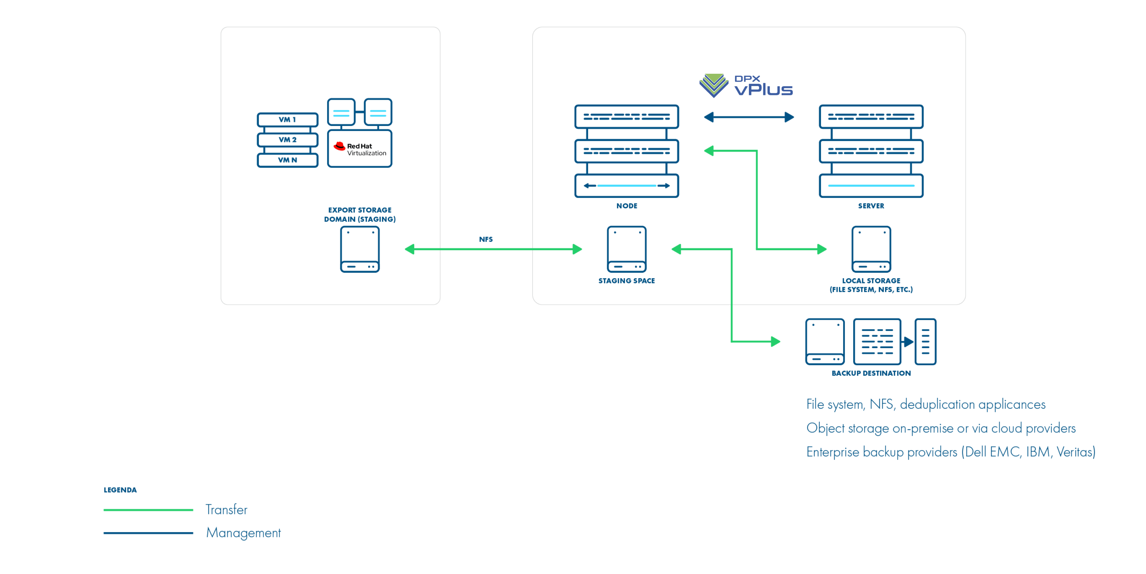 This setup requires you to create a storage domain used for VM export. The export storage domain should also be accessible by DPX vPlus Node in its staging directory. This implies that the storage space doesn't have to be exported by DPX vPlus Node - it can be mounted from an external source. The only requirement is to have it visible from both the RHV host and the Node itself. Keep in mind that ownership of the files on the share should allow both DPX vPlus and RHV to read and write files.