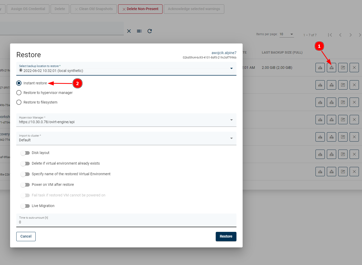 To use an instant restore feature, backup destination from which VM will be restored, has to be of a synthetic type. The restore process creates a NFS share on the DPX vPlus node, later this share is attached to the RHV as a new storage domain. Then it creates a new virtual machine and attaches the disks from the newly created storage domain to it. ​ To use instant restore you have to click the restore button in the instances list and choose the option instant restore.