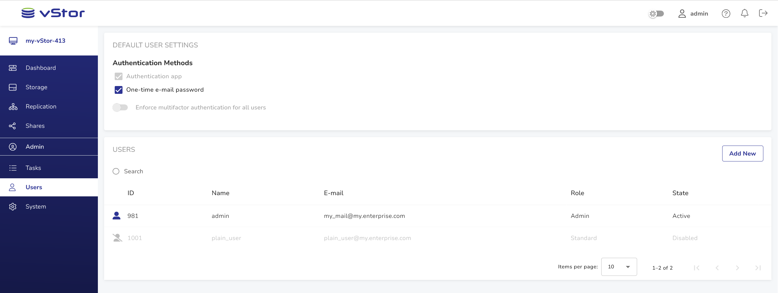 • Admin: Users with the Admin role have unrestricted access to all resources and capabilities within vStor, including user management and system configuration.