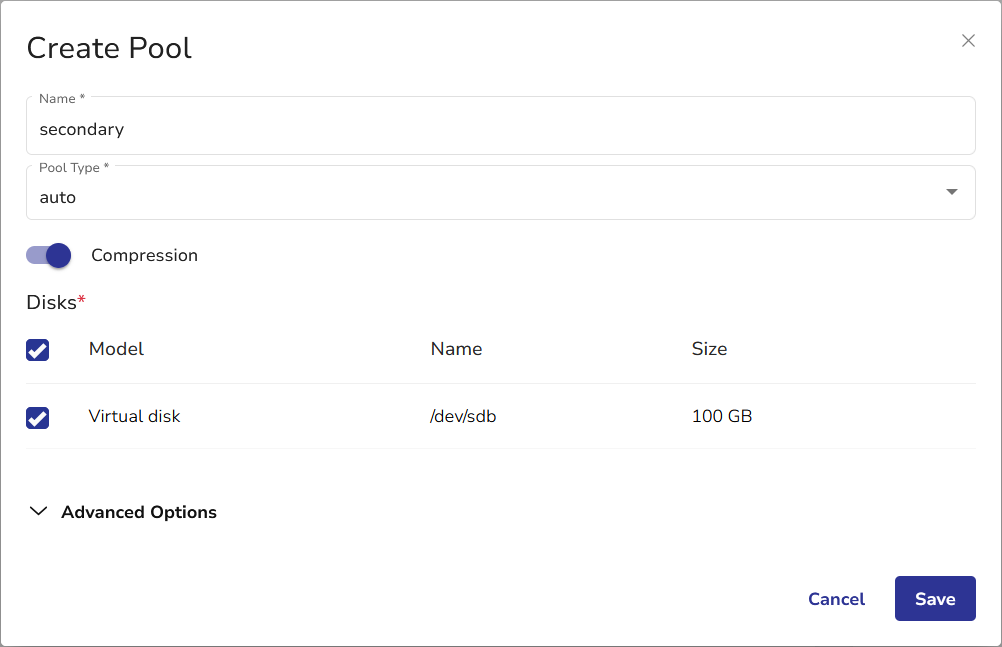 - Select options like enabling/disabling compression, deduplication, and synchronous writes.