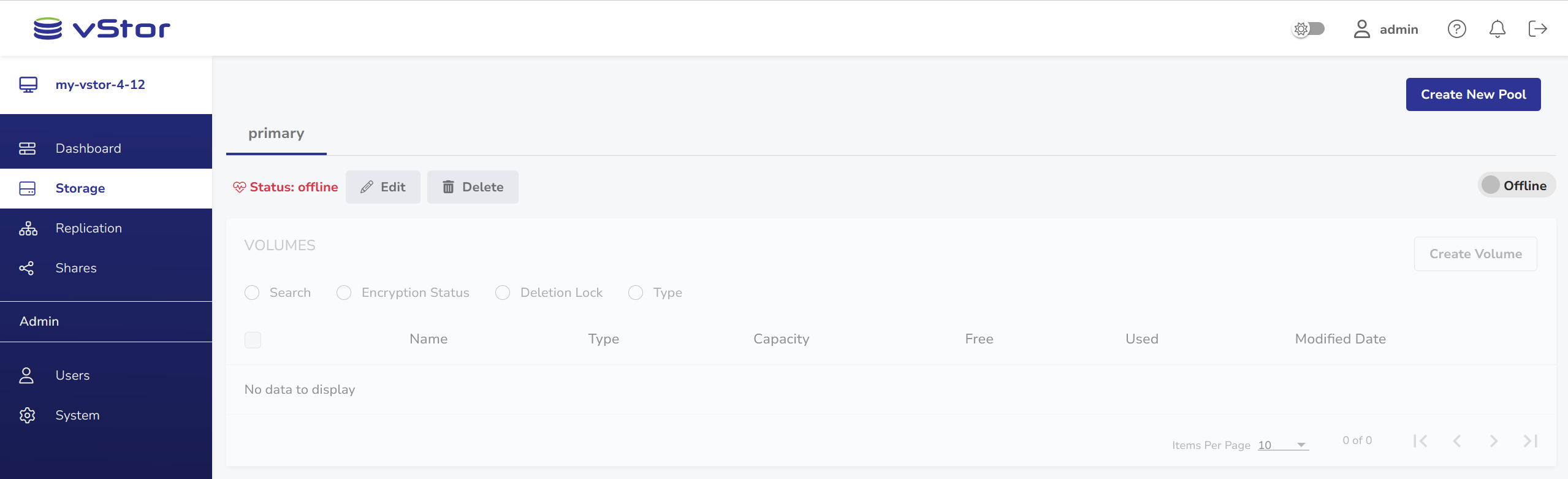 You can also create a storage pool using the vStor web interface by navigating to the Storage tab, clicking Create New Pool, and specifying its details: