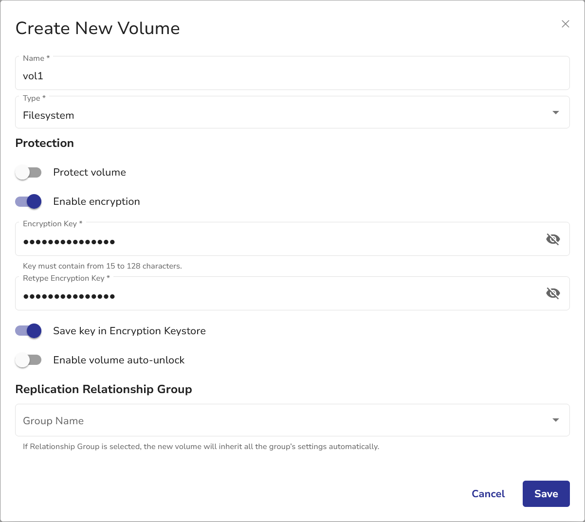 - (Optional) Select the Enable encryption to enable encryption on the volume. Encryption may only be applied to volumes of type Filesystem and Lun. If encryption is enabled, set an encryption password. Optionally, enable Save key in Encryption Keystore to store the password securely.