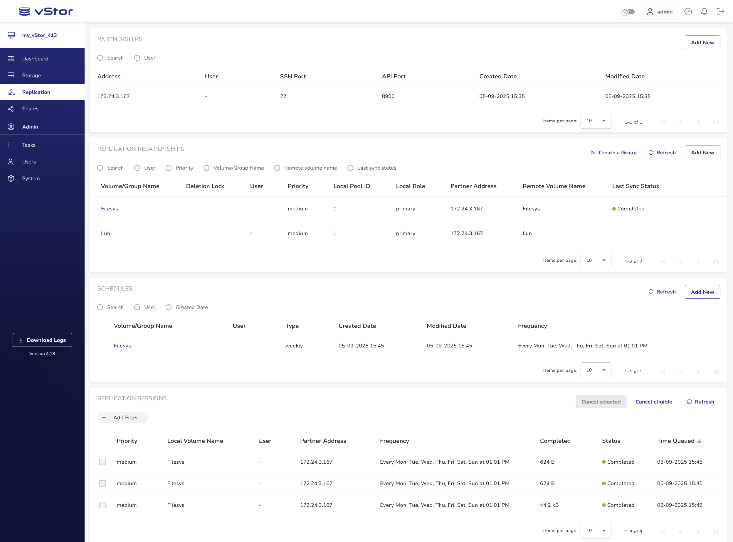 This section displays configured replication mappings between the local vStor and the partner vStor volumes.
