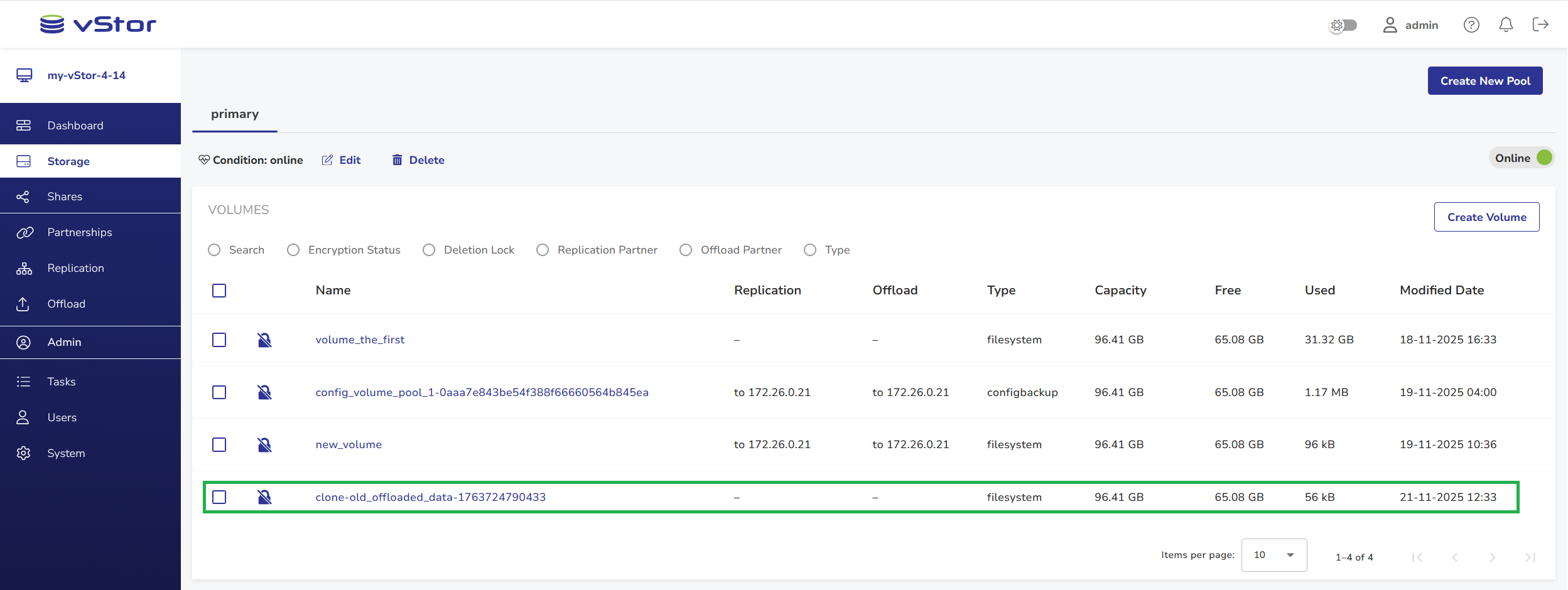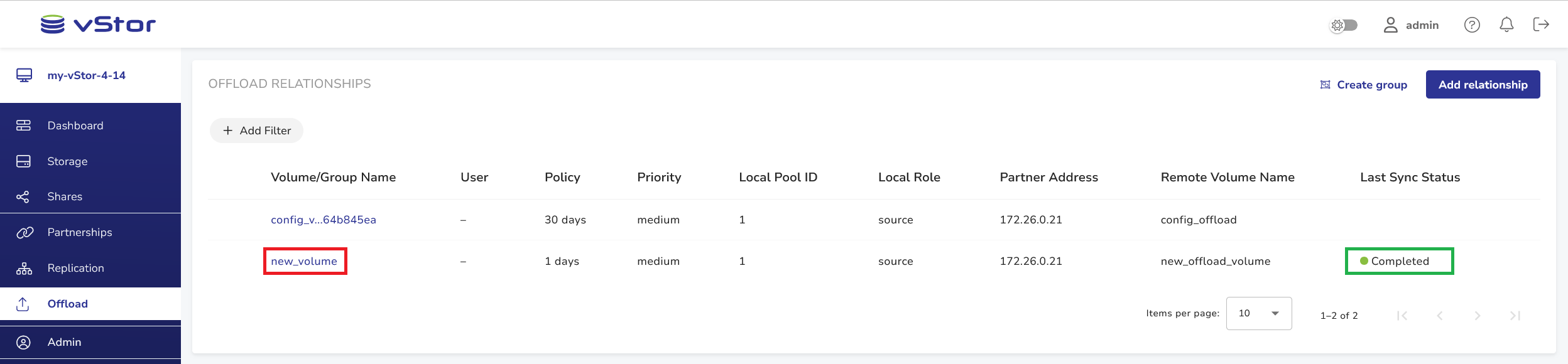 - Go to the Offload view on the source vStor and find the volume you want to access. Ensure its Last Sync Status is Completed.