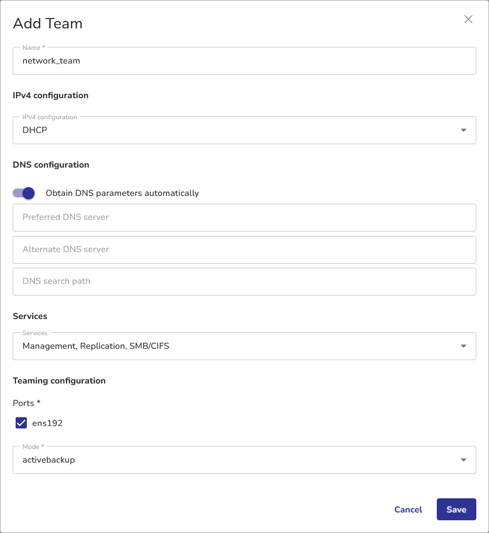 - Mode – Select the teaming mode. Options include: lacp, broadcast, roundrobin, activebackup, loadbalance, random.