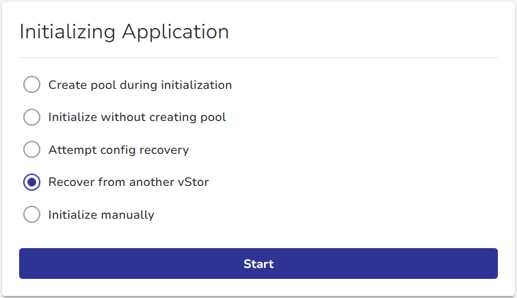 admin. If this is your first login attempt, the password will beadmin. You will be prompted to change the password. - In the first step of vStor initialization, select Recover from another vStor.