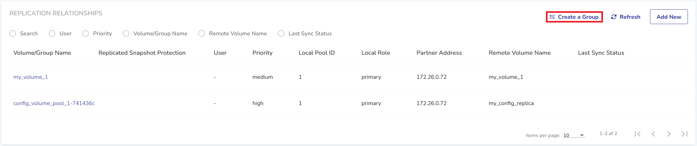 If volumes with already defined relationships are selected, their target replication pool will remain unaffected by the selection in the Create Group window.