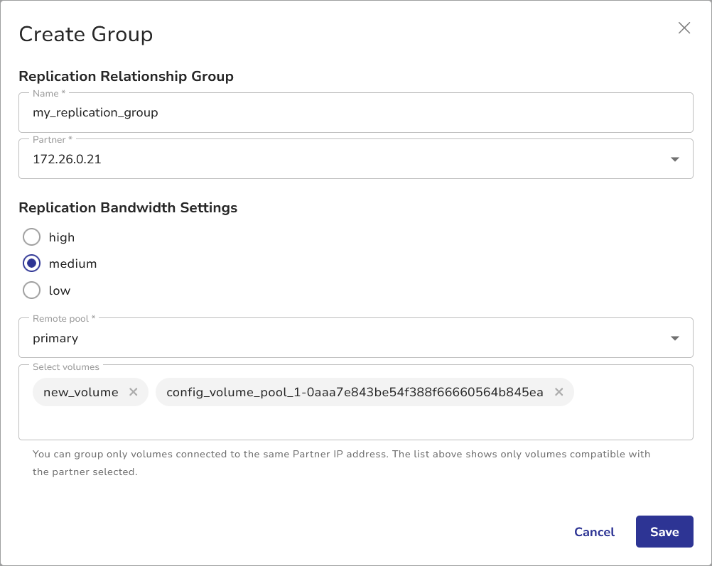 - Remote pool: Select the pool on the partner server where the volumes will be replicated to.