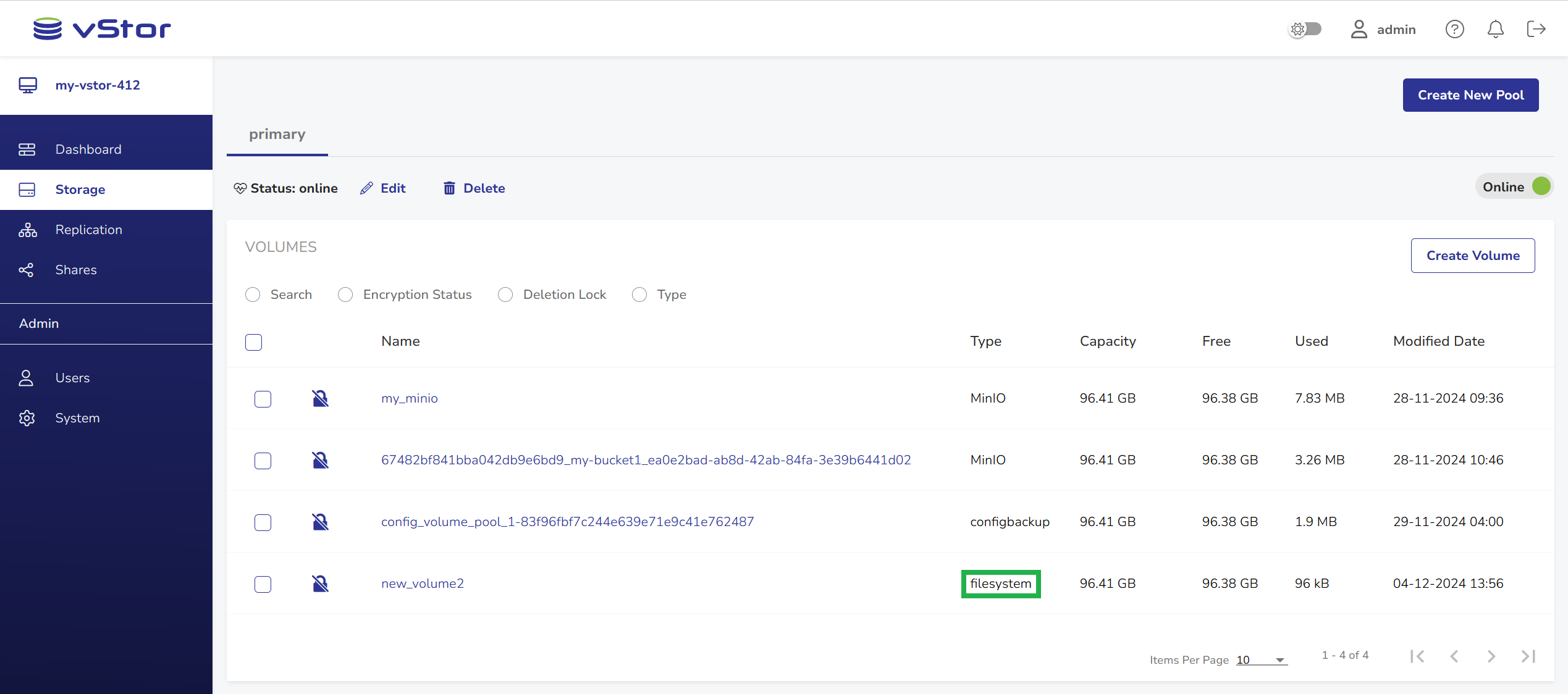 5 | filesystem | 1 | No | 96.39GB | 96.39GB | 24.00KB | myvol1