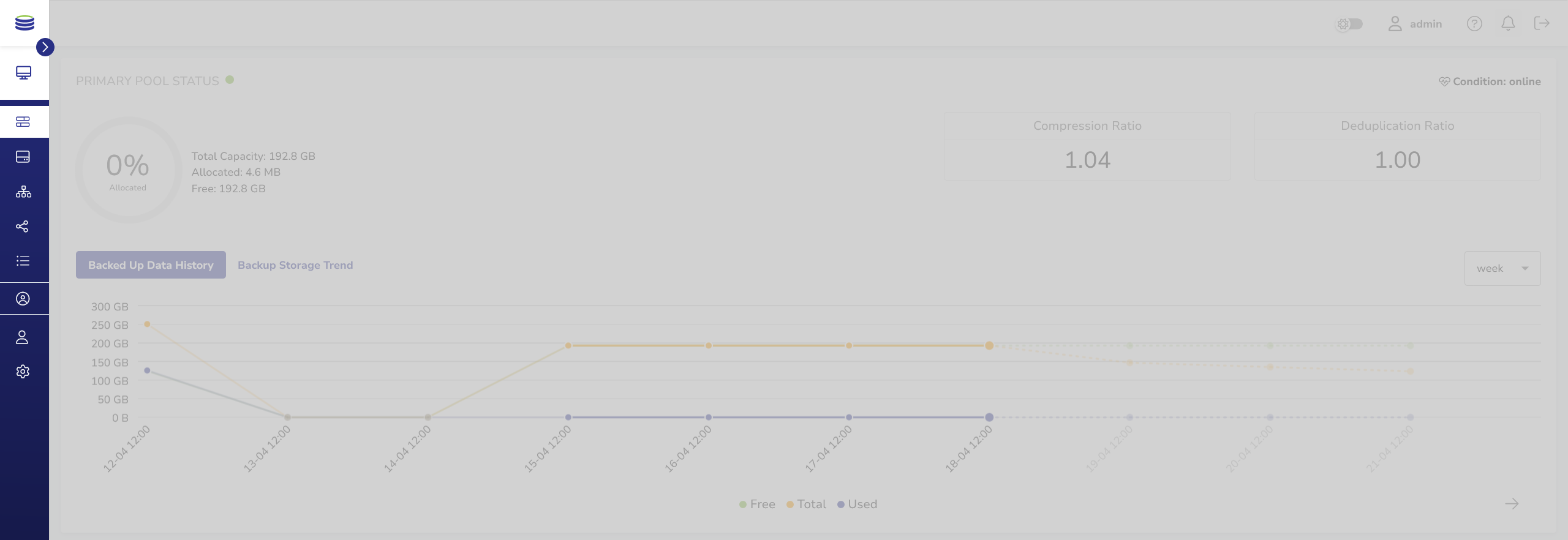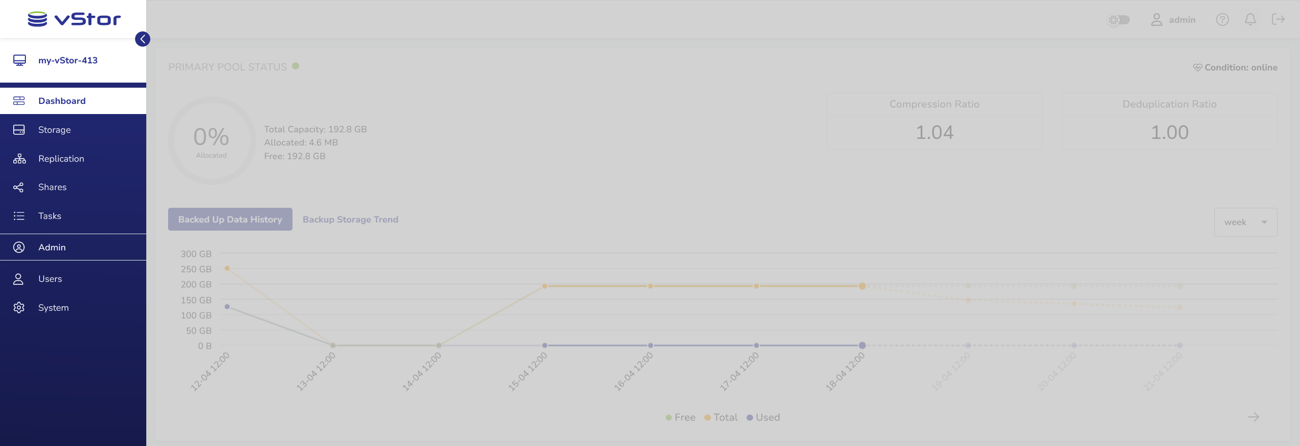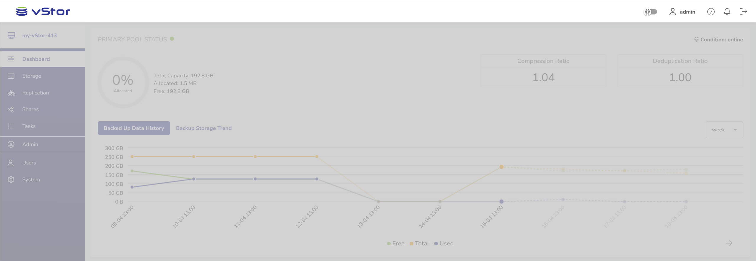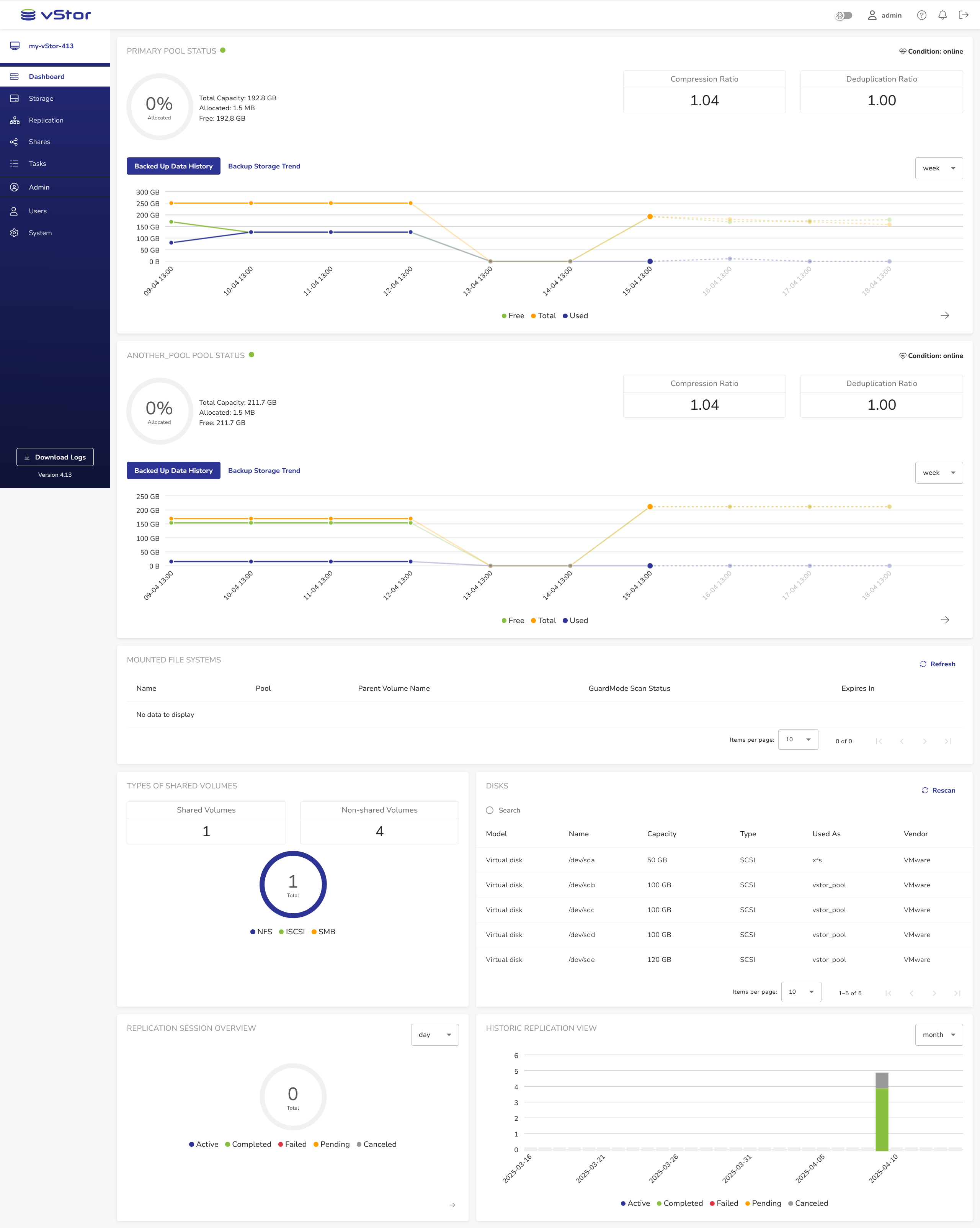 After successful login, the vStor dashboard is shown. It presents an overview of the vStor’s performance, such as pool usage, mounted file systems, volumes, disks and replication summary.