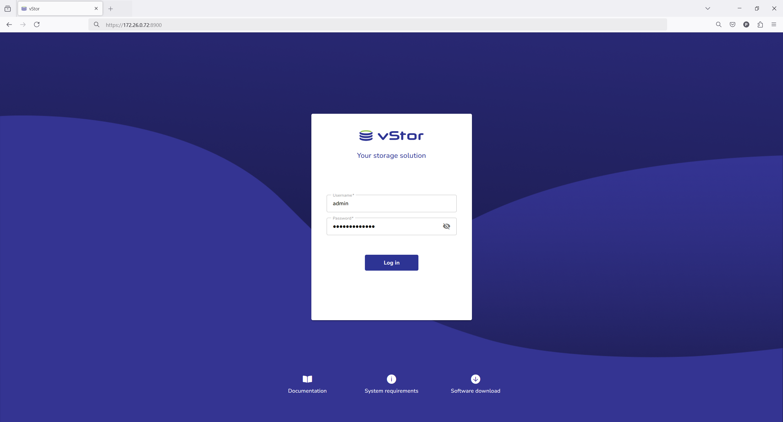 The log-in page consists of the log-in pane, where you need to specify your credentials to log in. See Logging to vStor Web Interface.