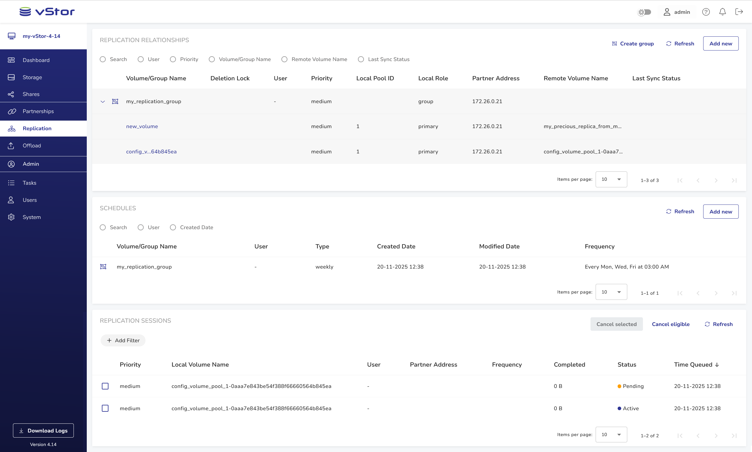 - Use the Add new button to configure a new replication relationship for a local volume.