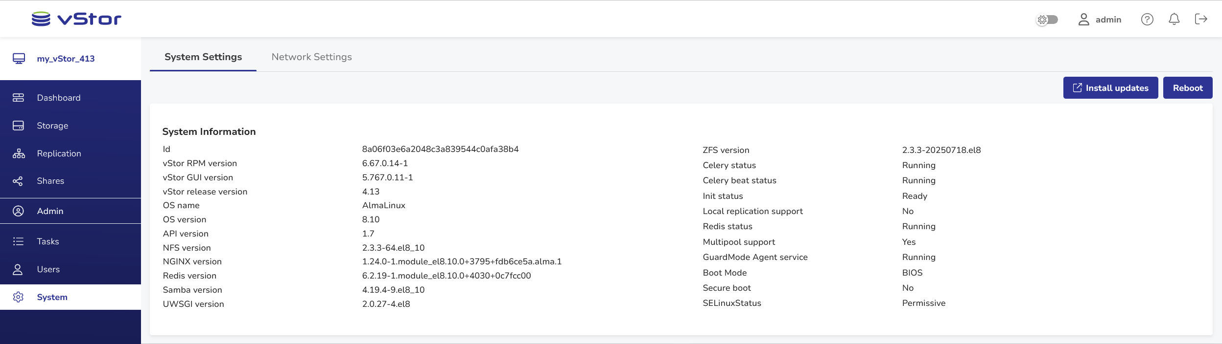 The System view consists of two tabs: System Settings and Network Settings. From here, administrators can view and manage most local and network settings for vStor.
